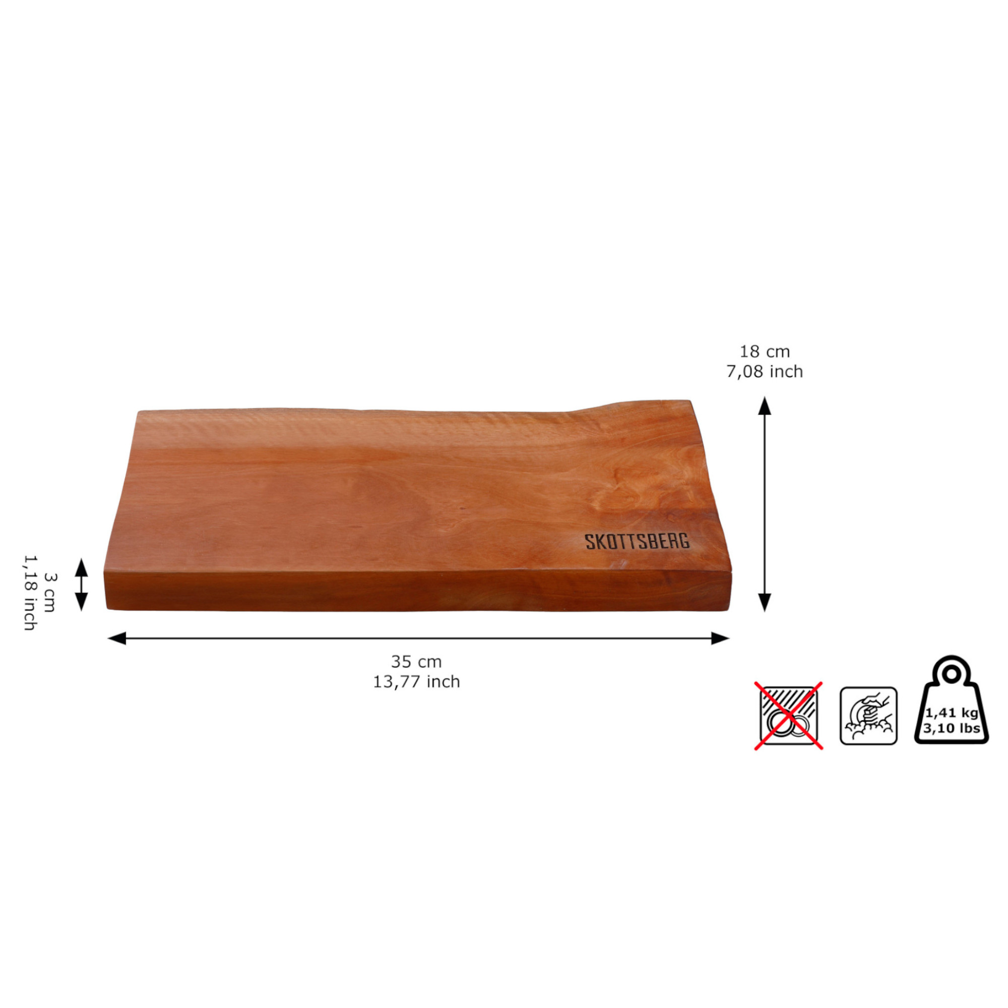 Das Servierbrett ist beidseitig verwendbar und bietet mit seinen großzügigen Maßen von 35 x 18 x 3 cm ausreichend Platz für vielfältige kulinarische Kreationen. Die zwei hygienisch gefrästen Griffe erleichtern das Tragen und Servieren.